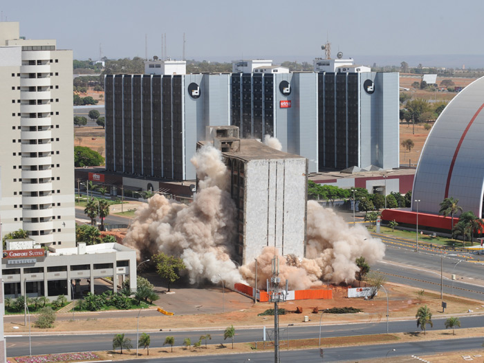 O esqueleto de um prédio de 14 andares abandonado foi implodido na manhã deste domingo (19) no Setor Hoteleiro Norte, em Brasília. A construção veio abaixo em cinco segundos. Foram utilizados 150 quilos de dinamite.